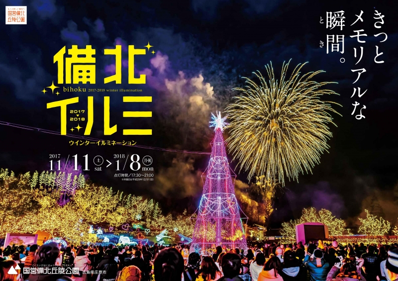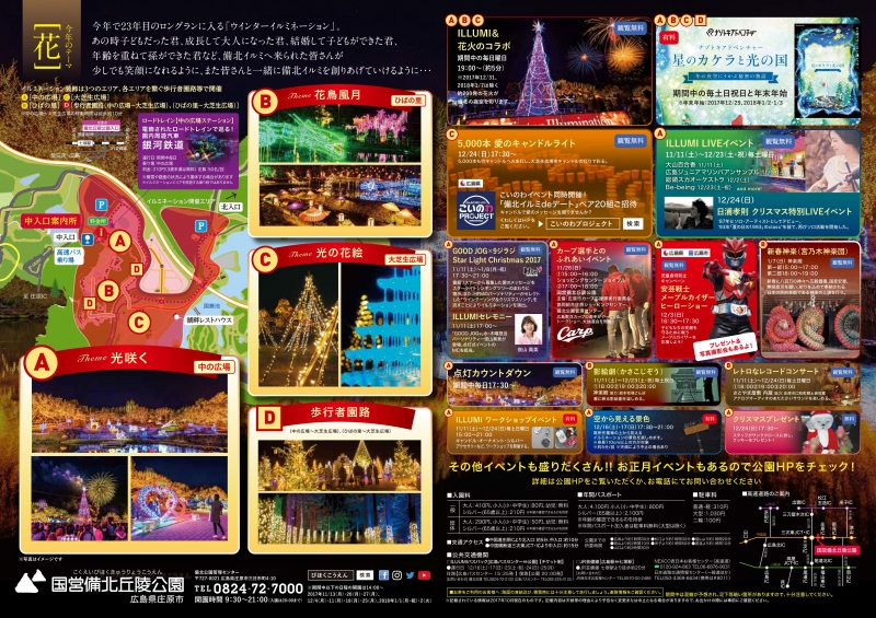 国営備北丘陵公園のイルミネーションは、樹木や地形を活かした造形により、奥行き感のある、光につつまれるた様な光景を、お楽しみいただけます。地形を活かし、バラエティーに富んだ、備北公園ならではのイルミネーションがご覧いただけます。また、期間中週末を中心に「コンサート」や「ワークショップ」など、イベントも盛りだくさんです。