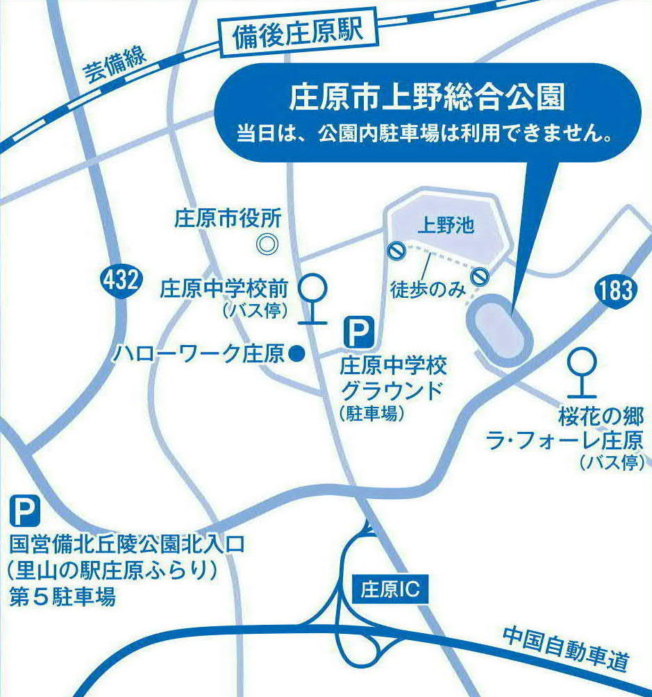 | アクセス | 〇JR芸備線・バスをご利用の場合 ・(JR・バス)備後庄原駅(シャトルバス10分) ・(バス)桜花の郷ラ・フォーレ庄原(徒歩7分)―庄原中学校前(徒歩15分 または シャトルバス10分) 〇お車をご利用の場合 ※当日は庄原市上野総合公園内の駐車場はご利用できません。以下駐車場をご利用ください。 ・庄原中学校グラウンド(400台) ・国営備北丘陵公園北入口(里山の駅庄原ふらり)北入口 第5駐車場(600台)※駐車場に限りがあるため、お乗り合わせの上お越しくださいませ。 |