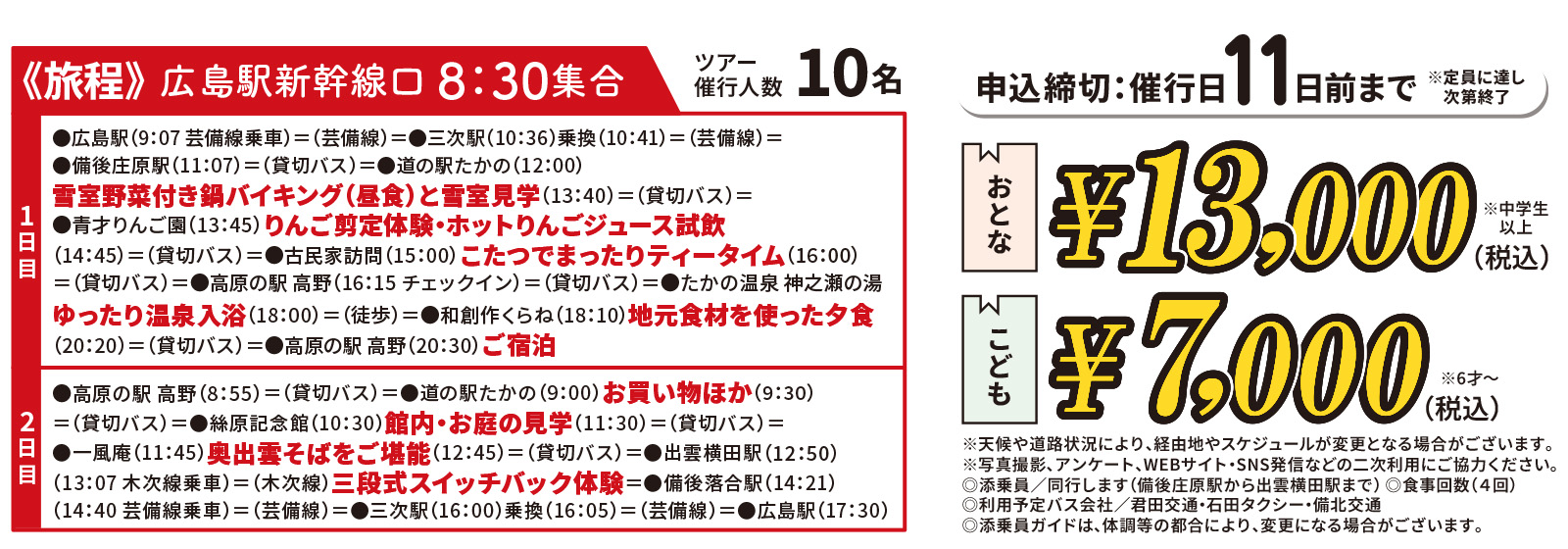 芸備線で行くローカルダイブトレイン 高野ガイドと巡る 雪国ガストロノミーとたたらの旅 広島駅から芸備線に揺られ、雪室野菜と高野の温泉に癒される。 地元の人とふれあい、りんごを剪定し、庭園を巡り、奥出雲そばを味わう。 “1泊2日なのに深く旅した気持ちになれる”大人のローカル旅です。 予約はコチラ パンフレットPDF