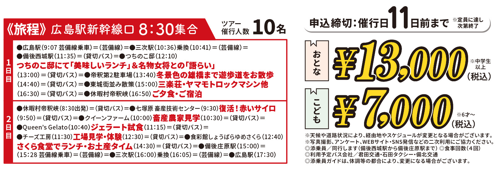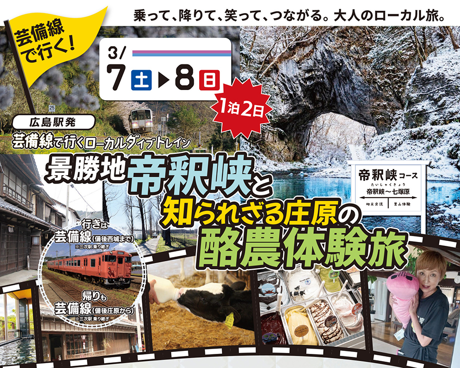 芸備線で行くローカルダイブトレイン 景勝地帝釈峡と知られざる 庄原の酪農体験旅 広島駅から芸備線に揺られ、自然美が色濃く残る帝釈峡へ。 名物女将と語らい、街並みを歩き、チーズ工房で体験し、庄原の恵みを味わう。 “1泊2日なのに深く旅した気持ちになれる”大人のローカル旅です。 予約はコチラ パンフレットPDF