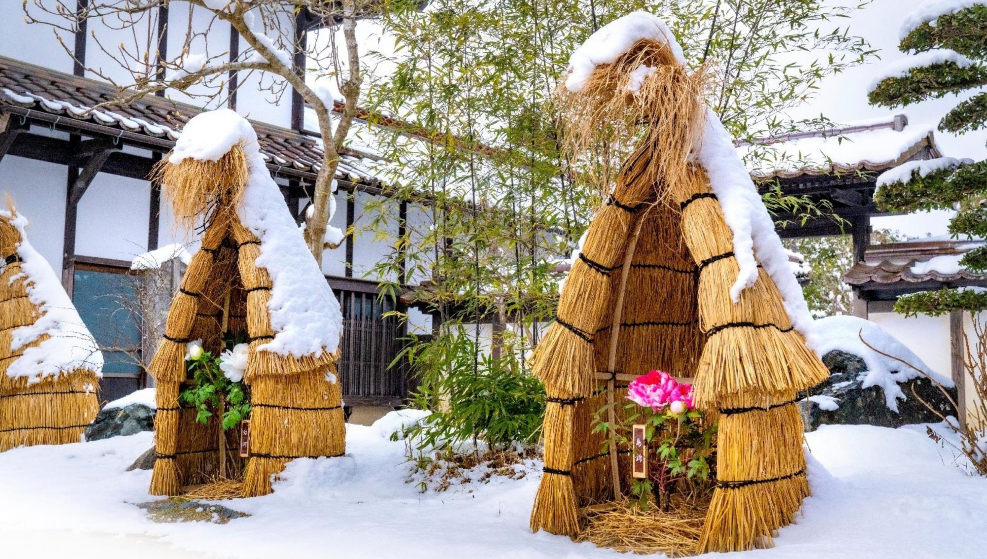 藁帽子(藁のこも)をかぶり、寒さに耐え、凛と佇む「冬咲きぼたん」が冬のひばの里の景色を彩ります。雪