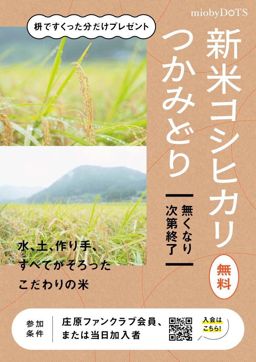 ファンクラブ会員特典企画として、庄原自慢の新鮮なお米を枡でつかみ取りした分だけお持ち帰りいただけます。庄原の"食の豊かさ"をぜひご体験ください。当日ファンクラブ会員に申し込みいただければ、ご参加も可能です。