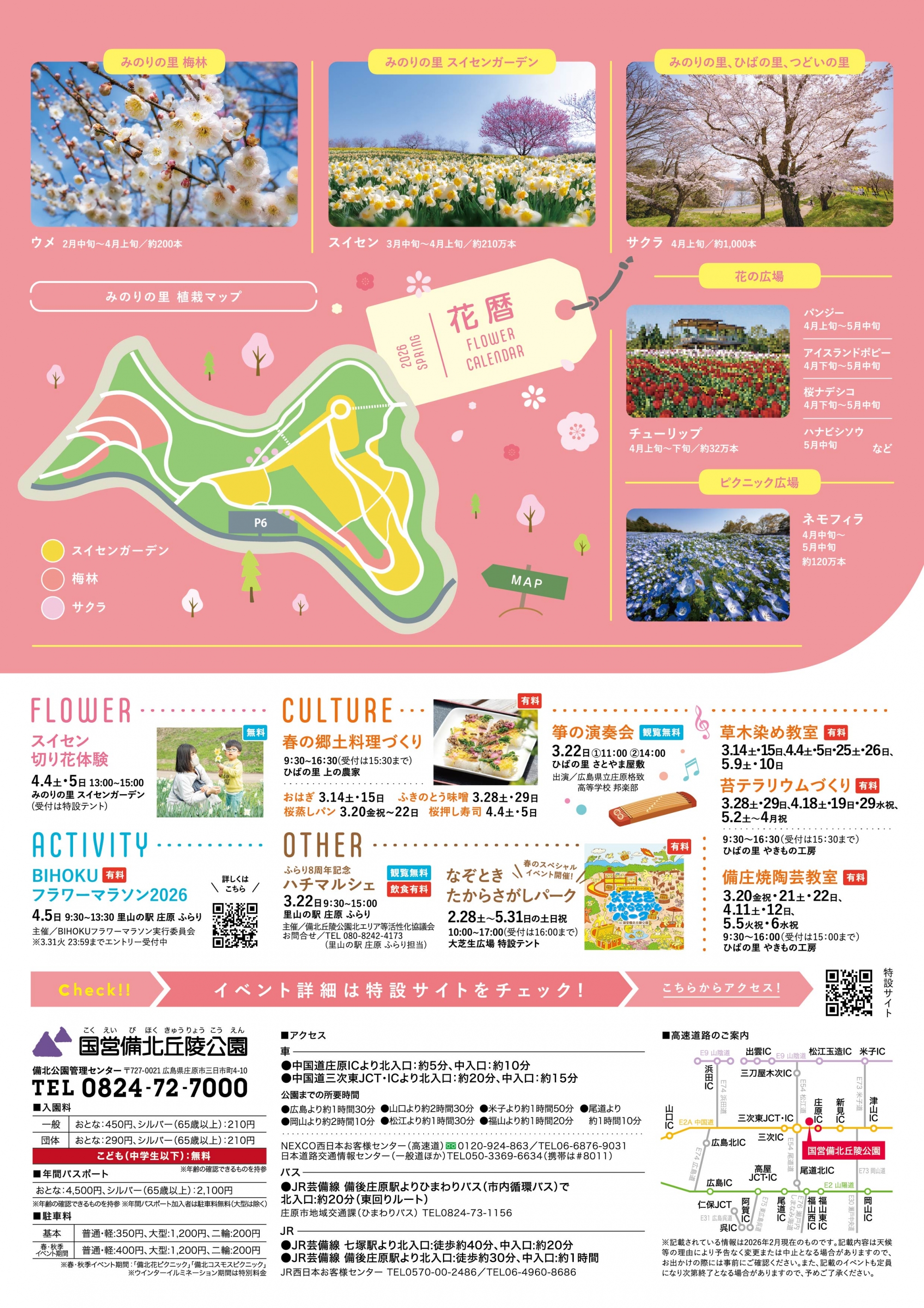 | 料金 | 入園料(一般) ・おとな 450円 ・こども(中学生以下) 無料 ・シルバー(65歳以上) 210円 ※シルバーの方は年齢確認ができるものをご持参ください。 駐車料(春・秋・冬期イベント期間) ・普通、軽 400円 ・大型 1,200円 ・二輪 200円 ※春・秋・冬期イベント期間…「備北花ピクニック」「備北コスモスピクニック」「ウインターイルミネーション」 入園料無料日 ・2026年5月3日(日・祝)・4日(月・祝) |
