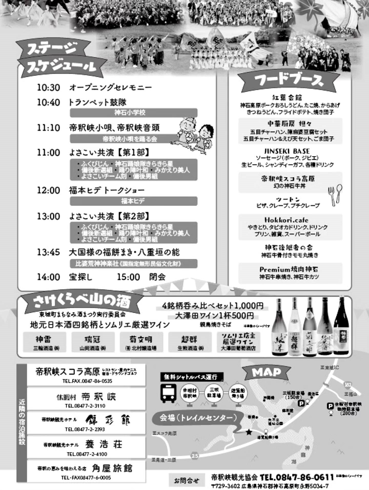 | お問い合せ | 主催/帝釈峡観光協会 後援/庄原市・神石高原町・庄原観光推進機構・神石高原町観光協会 お問い合わせ/帝釈峡観光協会 TEL.0847-86-0611 〒729-3602広島県神石郡神石高原町永野5034-7 |