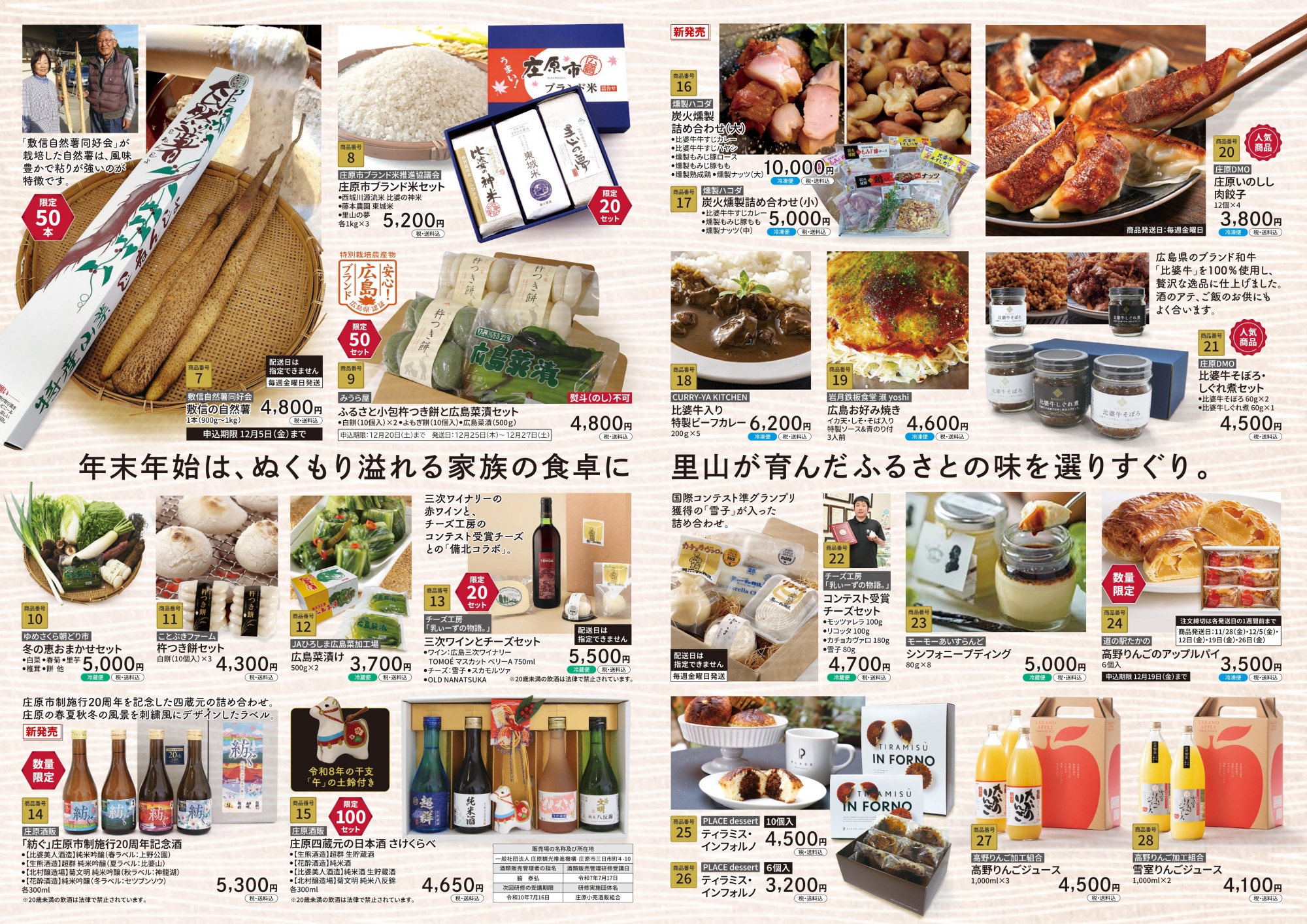 昨年の冬ギフトでは大好評だった「備北もんギフト」は、新米のお供セットとスイーツセットをご用意しました。 このほか、「庄原市ブランド米セット」や「庄原市制施行20周年記念酒」など、生産者のこだわりが詰まった産直ギフトをお届けします。