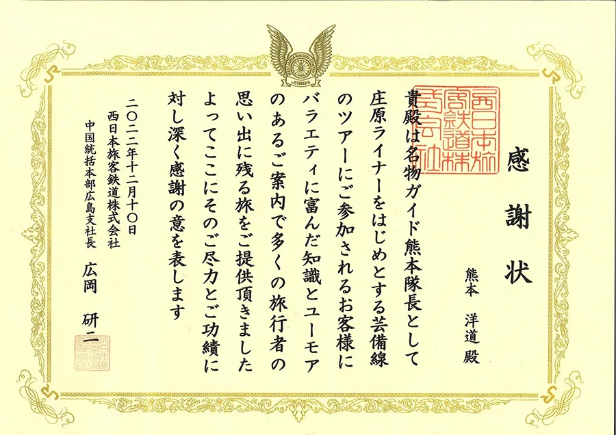 旅行会社、シニア会、青年会、女性会、学校など、数千人を案内。JR西日本から感謝状も授与された、庄原が誇るレジェンドガイドです!庄原の「鉄道と歴史と自然を語らせたら右に出る者なし!」あなたの旅に、熊本隊長のストーリーをプラスしませんか?