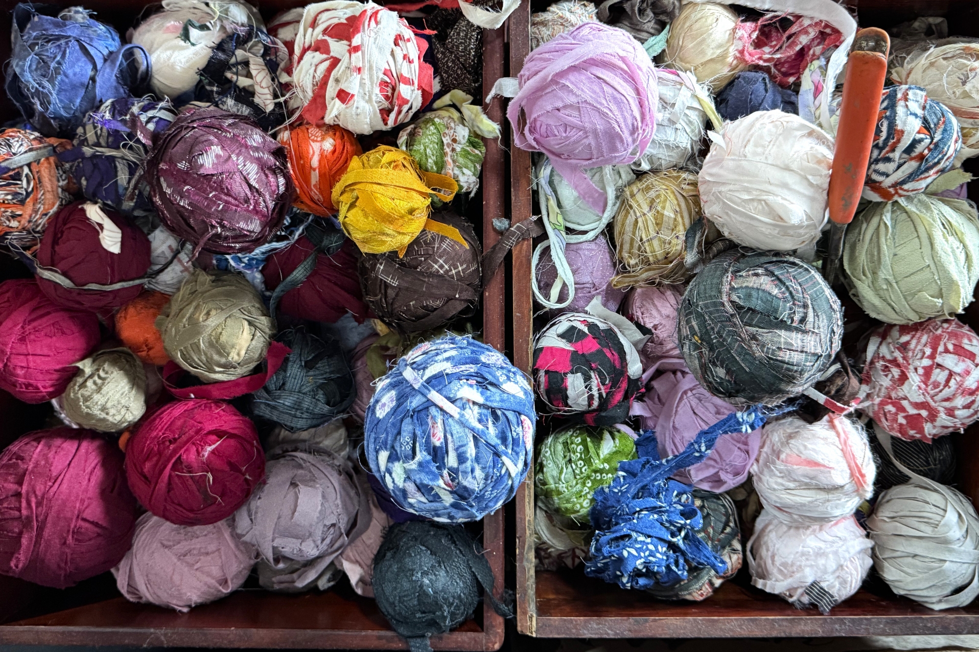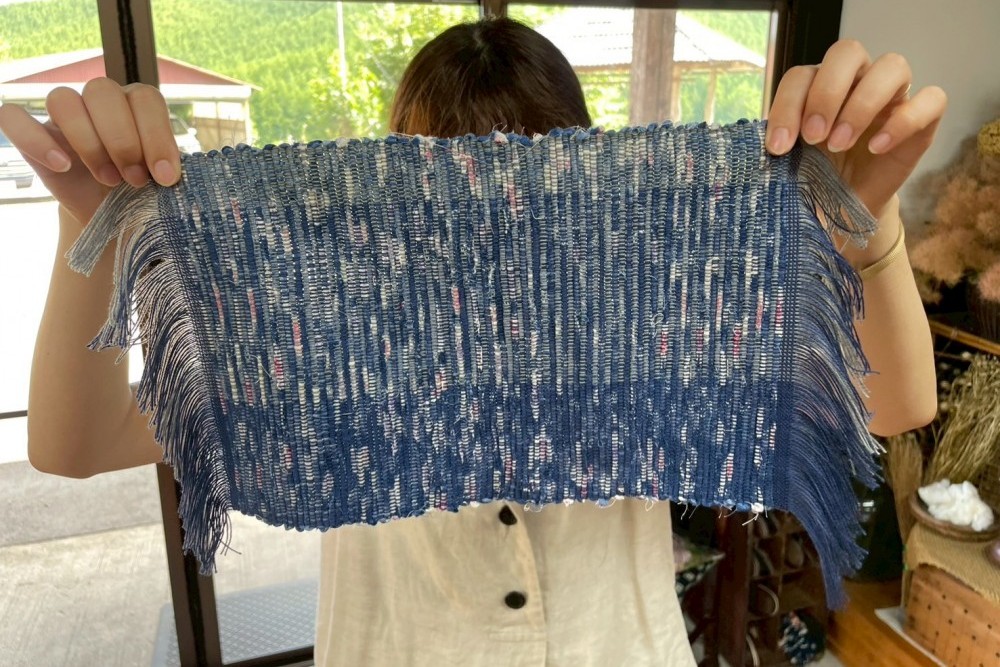里呼織り工房で体験できるのは、使わなくなった布を細く裂いて横糸として再利用する、昔ながらの「裂き織り」という技法です。古くなったものを工夫して使う、里山の知恵とあたたかさが感じられます。体験は、まず裂き布選びからスタートし、完成品をイメージしながら進めます。機織り機に向かい、足元のペダルを踏みながらシャトルを縦糸の間に入れて織り進める作業は、想像以上の楽しさと、世界に一つだけのオリジナル作品が完成する達成感があります。